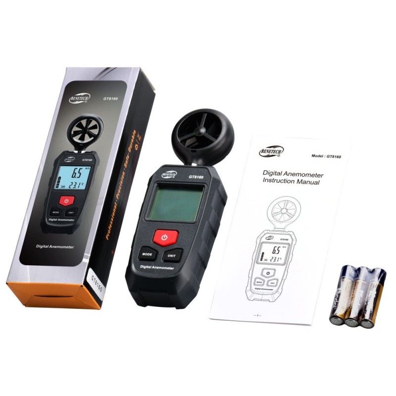 Komplektacija: anemometras Benetech GT8160, 3 x AAA 1,5 V baterijos, naudotojo instrukcija (PL/EN), originali pakuotė.