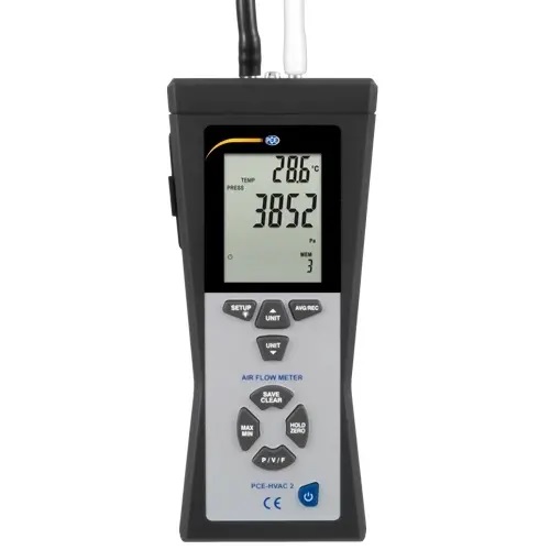 PCE-HVAC 2 yra srauto matuoklis, naudojamas oro greičiui, oro slėgiui, oro srautui, diferenciniam slėgiui ir aplinkos temperatūrai nustatyti. Su srauto matuokliu galima atlikti matavimus mažose vamzdžių sistemose ir kitose uždarose erdvėse. Išsaugotas matavimo vertes galima peržiūrėti pačiame įrenginyje arba kompiuteryje. Duomenų perkėlimas į kompiuterį atliekamas greitai ir paprastai – naudojant USB prievadą. Realaus laiko matavimo vertes taip pat galima rodyti kompiuteryje, naudojant USB jungtį ir atsisiunčiamą su kompiuteriu suderinamą programinę įrangą. Be ergonomiško dizaino, srauto matuoklis turi apšviestą ekraną, leidžiantį jį naudoti prasto apšvietimo sąlygomis. Matuoklis PCE-HVAC 2 turi sriegį apačioje, todėl įrenginį galima montuoti ant trikojo. Prietaiso viršuje įkišamos matavimo žarnelės, kad būtų galima prijungti Pitoto vamzdelį.