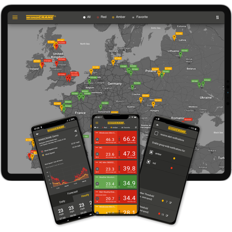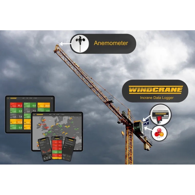 Windcrane vėjo matavimo rinkinys (WCMK-TCC) skirtas bokštiniams kranams statybų aikštelėse ir yra suderinamas su visų tipų kranais. Sistema leidžia realiuoju laiku stebėti vėjo greitį, per mobiliąją programėlę ar internetinę platformą gauti saugos įspėjimus, o taip pat pasiekti istorinius duomenis, padedančius pagrįsti darbo sustojimus dėl oro sąlygų.