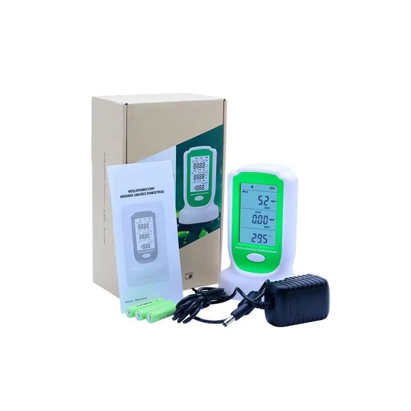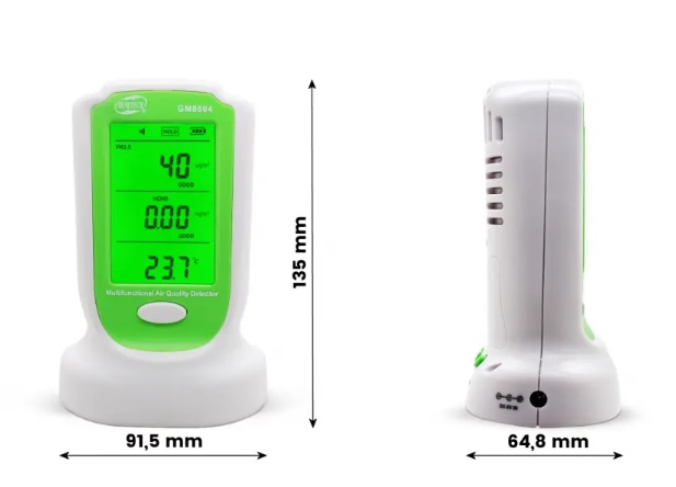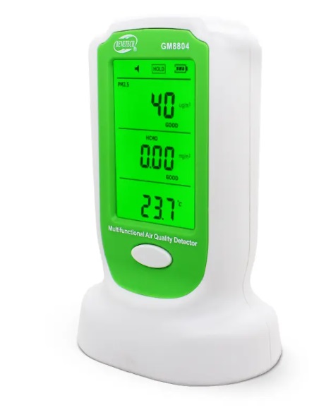 Prietaisas skirtas smogui (PM 2,5, PM 10) ir formaldehido koncentracijai matuoti. Oro kokybės matuoklis GM8804 yra nešiojamas daugiafunkcis prietaisas, galintis vienu metu aptikti kietųjų dalelių koncentraciją ore, formaldehido koncentraciją, temperatūrą ir drėgmę. Prietaisas rodo tikslų matavimą, reaguodamas realiu laiku, nuolat rinkdamas ir aptikdamas formaldehido ir kietųjų dalelių koncentraciją ore. Mažiausias dalelių dydis yra 0,3 um.