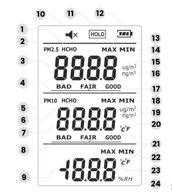 - PM 2,5 ir PM 10 matavimo diapazonas: 0–5000 ug/m³