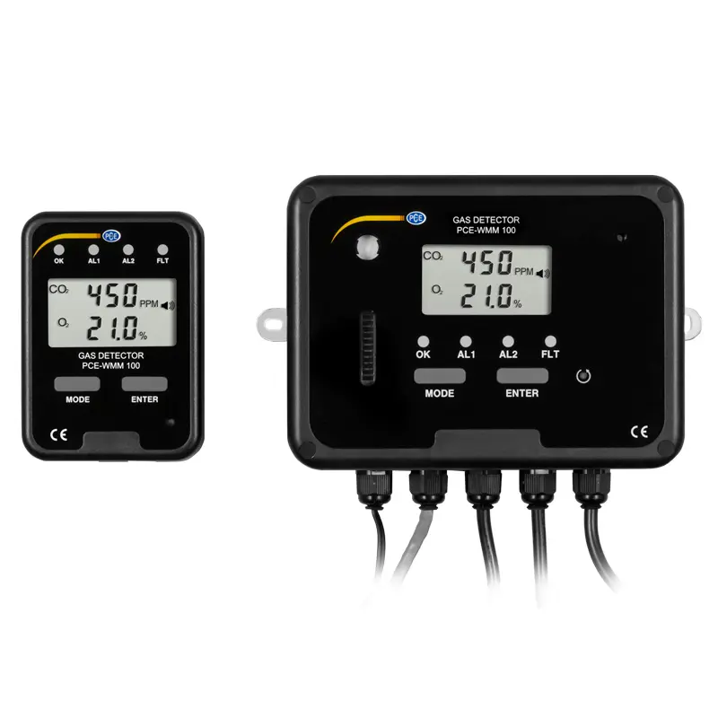 CO2 įspėjimo prietaisą PCE-WMM 100 sudaro pagrindinis blokas ir nuotolinis ekranas. CO2 dujų detektorius PCE-WMM 100 naudojamas anglies dioksidui ir deguoniui fiksuotoje vietoje matuoti. CO2 įspėjamasis prietaisas apsaugo žmones nuo bekvapių dujų CO2 ir įspėja apie mažą deguonies kiekį ore. Dujų įspėjimo sistema išmatuotas vertes rodo LCD ekrane. Įspėjamasis CO2 prietaisas PCE-WMM 100 turi dvi reles, kuriomis galima valdyti signalines lemputes arba garsinius signalus. Be to, CO2 įspėjamajame įrenginyje integruotas garsinis signalas, kuris pavojaus atveju skleidžia 80 db garsinį signalą. Įspėjamasis įtaisas gali būti naudojamas visur, kur gali išsiskirti CO2. Tai gali būti sandėliai, alaus daryklos, vyno rūsiai ar restoranai. Pagrindinis įrenginys apsaugotas pagal IP54. Priekyje esantys 4 šviesos diodai informuoja apie sistemos būseną.