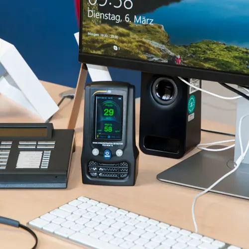 Lakiaisiais organiniais junginiais užterštas patalpos oras, be kita ko, gali sukelti galvos skausmą, nuovargį ar kvėpavimo takų dirginimą. Vieno tyrimo duomenimis, Europoje žmonės apie 90 proc. laiko praleidžia patalpose. Tokiu atveju vienam žmogui tenka įkvėpti nuo 10 iki 20 kubinių metrų oro, o tai atitinka 12-24 kg oro masės, t. y. gerokai daugiau nei per dieną suvartojama maisto ir skysčių. Todėl oro kokybė yra labai svarbus sveikatos ir gerovės veiksnys, kuris įpareigoja, patalpų oro kokybę reguliariai tikrinti. Tai ypač patogu padaryti naudojant spalvotą PCE Instruments oro kokybės matuoklio vertinimo skalę, kuri palengvina naudotojo orientaciją ir rodomų išmatuotų verčių klasifikavimą: kai tik viršijama ribinė vertė, ji ekrane rodoma spalvotai. Be to, jei pageidaujama, oro kokybės matuoklis, esant galimam pavojui, taip pat duoda garsinį signalą. Ši funkcija naudinga, pavyzdžiui, matuojant patalpų ore esančias kenksmingas medžiagas. Pavyzdžiui, PCE Instruments oro kokybės matuoklis leidžia veiksmingai nustatyti smulkių dulkių kiekį. Čia skiriamos smulkios dulkių dalelės, kurių skersmuo neviršija 10 μm (PM10), ir smulkios dulkių dalelės, kurių skersmuo neviršija 2,5 μm (PM2,5). Be to, oro kokybės matuoklis tiksliai parodo formaldehido koncentraciją patalpos ore. Lakiųjų organinių junginių (TVOD) matavimui smulkiųjų dulkių matuoklio matavimo diapazonas yra nuo 0 iki 9,99 mg/m³. Gamintojas oro kokybės matuoklį taip pat aprūpino didele atmintimi, kurioje telpa 5000 matavimo grupių, kad nustatytas vertes būtų galima atkurti ir vėliau. Be to, oro kokybės matuoklis teikia patikimą informaciją apie temperatūrą (nuo -20 °C iki +70 °C) ir drėgmę (nuo 0 iki 100 % RH). Išmatuotos vertės ekrane atnaujinamos kas sekundę.