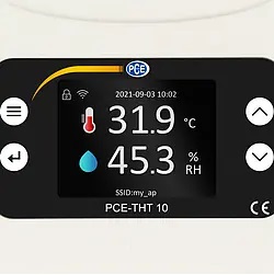 Oro kokybės matuoklio temperatūros matavimo diapazonas nuo -20 °C iki +60 °C, o drėgmės matavimo diapazonas – nuo 0 iki 99,9 % RH. Termohigrometro rodmenis galima tiesiogiai nuskaityti 2,3 colio spalvotame ekrane. Naudojant duomenų kaupiklio funkciją, visi termohigrometro rodmenys saugomi 12800 matavimo taškų atmintyje, todėl matuoklis gali būti naudojamas klimato sąlygoms stebėti: biuruose, logistikos įmonėse, šiltnamiuose ar klasėse. Užfiksuotų išmatuotų verčių analizę galima atlikti naudojant oro kokybės matuoklio programinę įrangą, kurią rasite „PCE Instruments“ atsisiuntimo portale. Svarbu paminėti ir tai, kad jeigu tinkle yra keli termohigrometrai, visus juos vienu metu galima valdyti per atsisiųstą programinę įrangą. Oro kokybės matuoklis maitinamas per 12 V nuolatinės srovės tinklo keitiklį arba per mikro USB sąsają. Montuojant ant sienos, nugarėlėje yra skylė termohigrometrui prie varžtų pritvirtinti. Jei reikia, termohigrometras gali būti aprūpintas ISO kalibravimo sertifikatu.