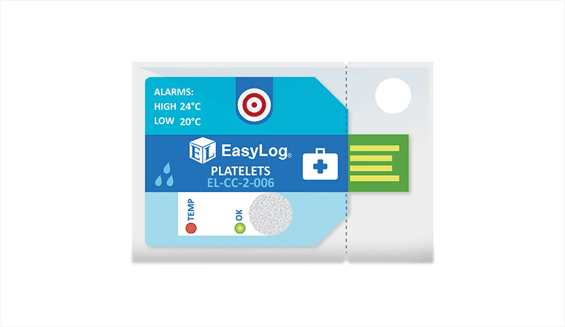 Vienkartinis EL-CC-2-006 PK10 trombocitų transportavimo duomenų kaupiklis, kurį galima įsigyti po 10 vienetų, matuoja ir saugo informaciją apie temperatūrą ir drėgmę. Įrenginyje yra iš anksto sukonfigūruoti aukštos (24 °C) ir žemos (20 °C) temperatūros aliarmai – tiesiog paspauskite mygtuką, kad pradėtumėte registravimą. Registravimo seanso metu paspaudus mygtuką užsidegs būsenos šviesos diodai, kurie greitai parodys, ar temperatūra bet kuriuo metu viršijo aliarmo sąlygą. Baigę seansą, atidarykite IP67 kategoriją turinčią plastikinę pakuotę ir prijunkite kaupiklį prie kompiuterio per USB jungtį. Naudokite nemokamą „Windows“ skirtą „EasyLog CC“ programinę įrangą, kad atsisiųstumėte ir nubraižytumėte duomenis.