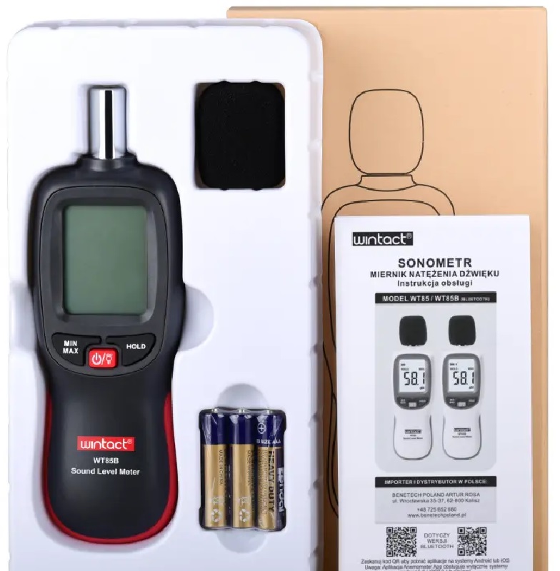 KOMPLEKTACIJA: garso matuoklis su Bluetooth Wintact WT85B, triukšmą sugerianti kempinė, 3 X AAA baterijos, naudojimo instrukcija, originali pakuotė
