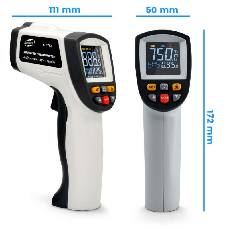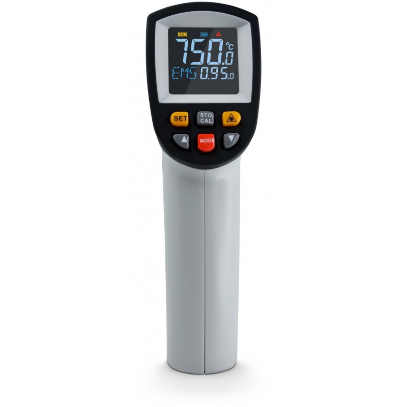 Pirometras - bekontaktis infraraudonųjų spindulių termometras su lazeriniu taikikliu. Temperatūros diapazonas yra nuo -50 iki 750 °C. Itin patogus naudoti - geros kokybės medžiagos ir ergonomiškas dizainas padidina termometro ilgaamžiškumą. Apšviestas ekranas leidžia dirbti su įrenginiu tamsoje. Pirometras turi automatinę išjungimo funkciją, todėl prietaisą naudosite ilgiau.