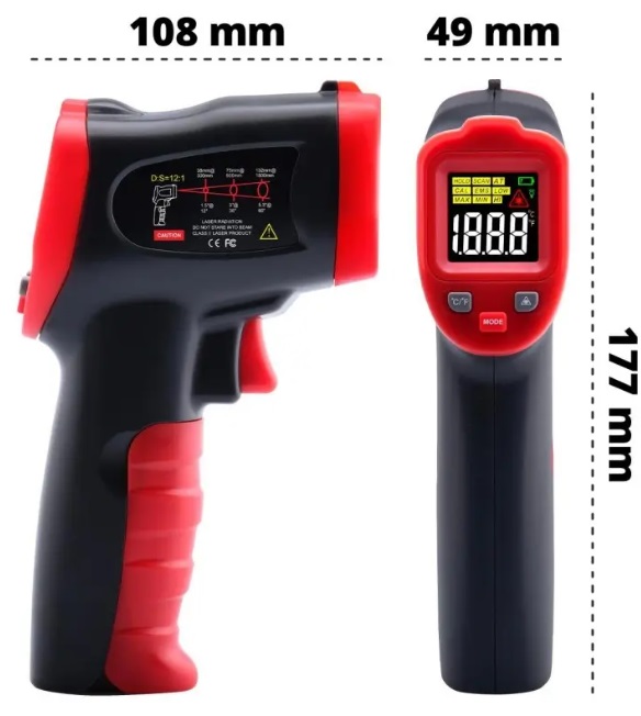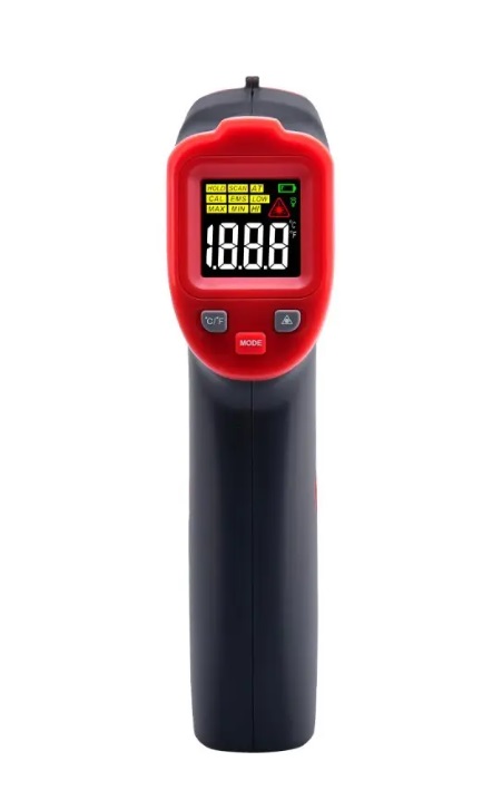 Aukštos kokybės bekontaktis infraraudonųjų spindulių termometras, skirtas matuoti temperatūrą nuo -50 °C iki 600 °C.