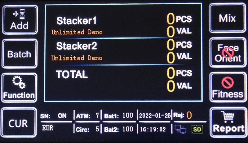 • Veikimo režimai: SORT – banknotų rūšiavimas; ADD – sumavimo funkcija; BAT – skyrių padalijimas; AUTO – automatinis startas