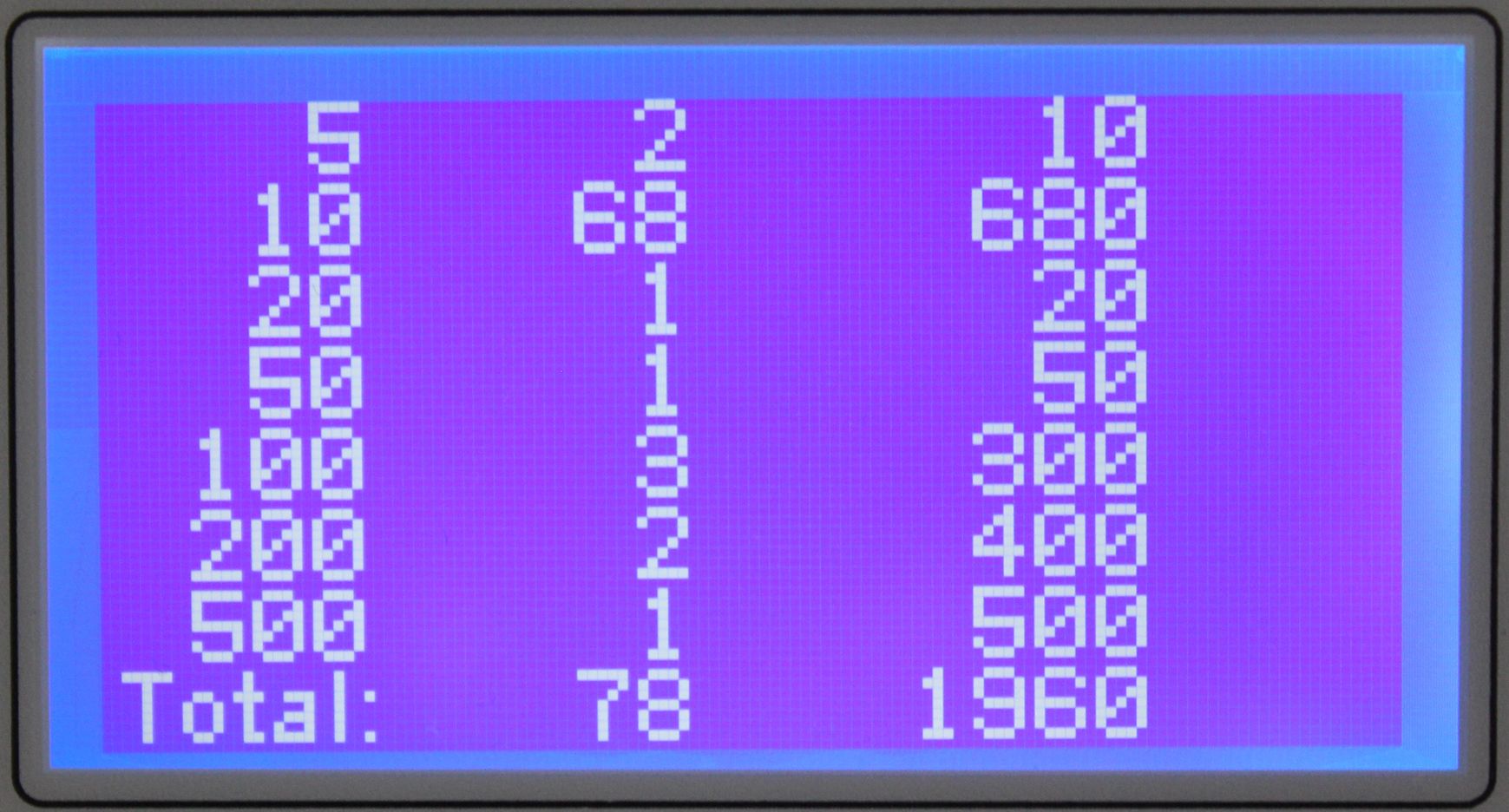 - Išrūšiuotų banknotų skaičiavimas: yra;