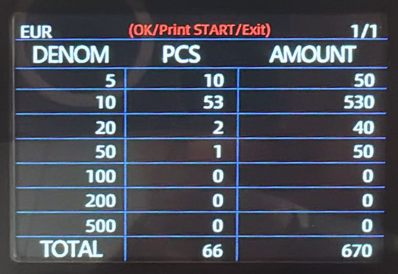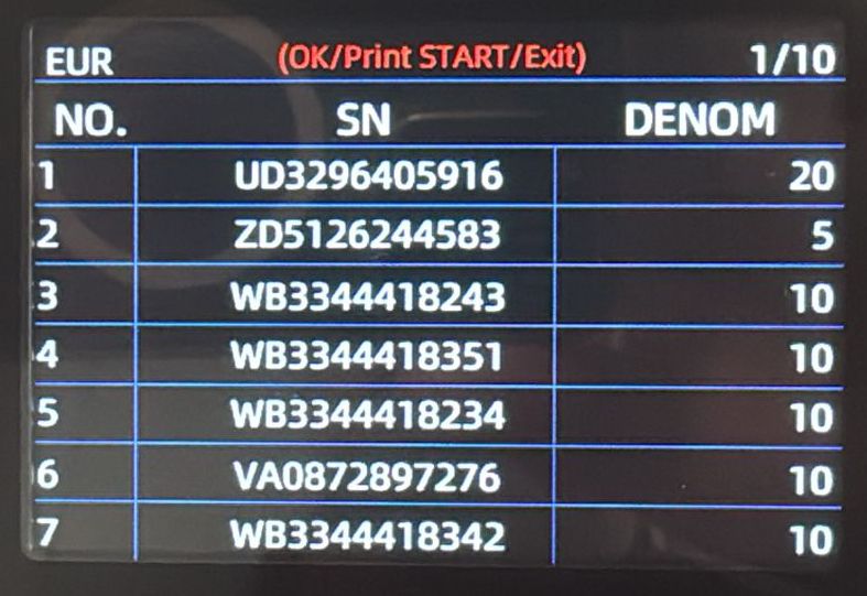 - Report – išsami ataskaita apie suskaičiuotus banknotus