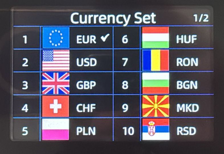 - Programinė įranga: EUR, USD, GBP, CHF, PLN, HUF, RON, BGN, RSD (kitos valiutos pagal užklausą)