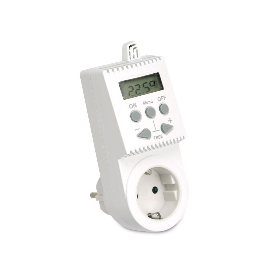 Kištukinis neprogramuojamas termostatas TS05 yra kištukinis termostatas, kuriuo lengva valdyti elektrinių šildymo sistemų (infraraudonųjų spindulių, tiesioginio šildymo prietaisų, rankšluosčių džiovyklių) nustatymus Jūsų namuose arba biure.