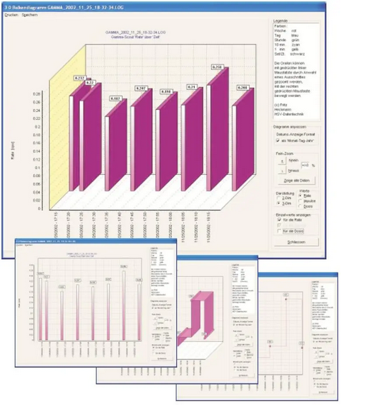 Matavimo duomenis taip pat galima perkelti į kitas skaičiavimo programas, tokias kaip Excel, kad būtų galima įvertinti (žr. aukščiau apie jų atsisiuntimo galimybes). Programinė įranga naudojama matuoklyje įrašytoms spinduliuotės reikšmėms perkelti į asmeninį arba kompiuterį.. standartai FCC-15 / jis taip pat gali būti naudojamas lėktuvuose) (GAMMA - SCOUT ® saugumą kontroliuoja TÜV ir jis atitinka CE standartus ir Amerikos Sertifikavimas. (pristatyme esanti programinė įranga leidžia įvertinti duomenis į kompiuterį) Duomenys gali būti vertinami kompiuteryje prietaiso/baterijos nereikia keisti 10 metų iuo matuokliu galima matuoti spinduliuotę dieną ir naktį/ nebūtina įjungti/išjungti.Šradioaktyvumas ir patikrintas valstybinės technikos mokyklos, turinčios kontrolės pažymėjimą Kiekvienas Geigerio skaitiklis turi galutinę kontrolę, ši kontrolė atliekama Apsaugos institute