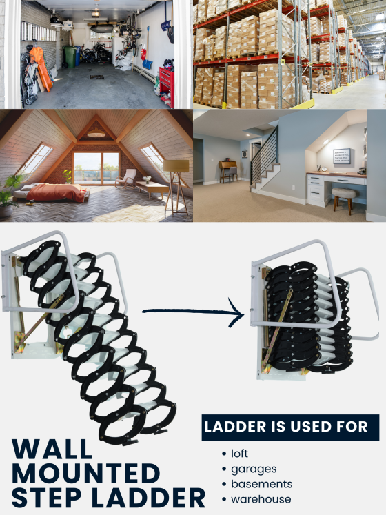 ADA Wall-Mounted ištraukiamos kopėčios tai kompaktiškas ir tvirtas sprendimas patogiam priėjimui prie palėpės, antresolės, lofto, stogo, garažo ar techninių patalpų, kur grindų erdvė yra ribota. Konstrukcija tvirtinama tiesiai prie sienos greta angos, o segmentinis sulankstomas mechanizmas leidžia kopėčias greitai išskleisti naudojimui ir kompaktiškai suskleisti, kai jos nereikalingos.