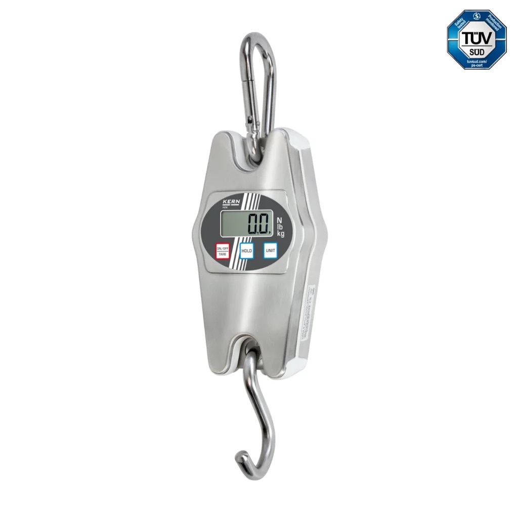 Šios svarstyklės atitinka EN 13155 ir EN 61010-1 saugos standartus bei turi TÜV sertifikatą, tai užtikrina saugų naudojimą. Dvigubas ekranas leidžia patogiai matyti svėrimo rezultatus iš abiejų pusių, o laikymo funkcija leidžia „užfiksuoti“ rodmenis patogiam nuskaitymui. Tvirta konstrukcija su nerūdijančio plieno kabliu ir grandine su saugos fiksatoriumi garantuoja patikimumą kasdienėje eksploatacijoje.