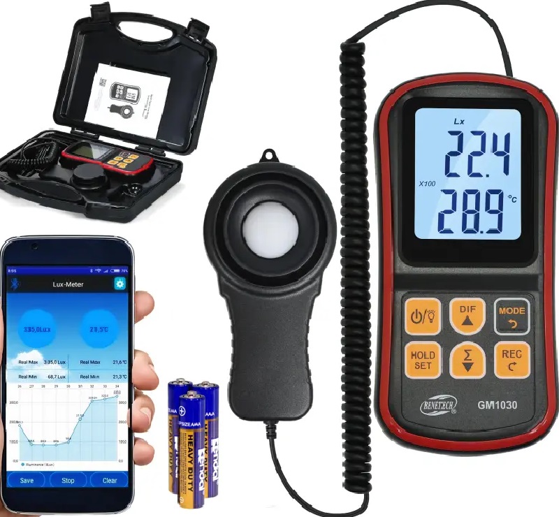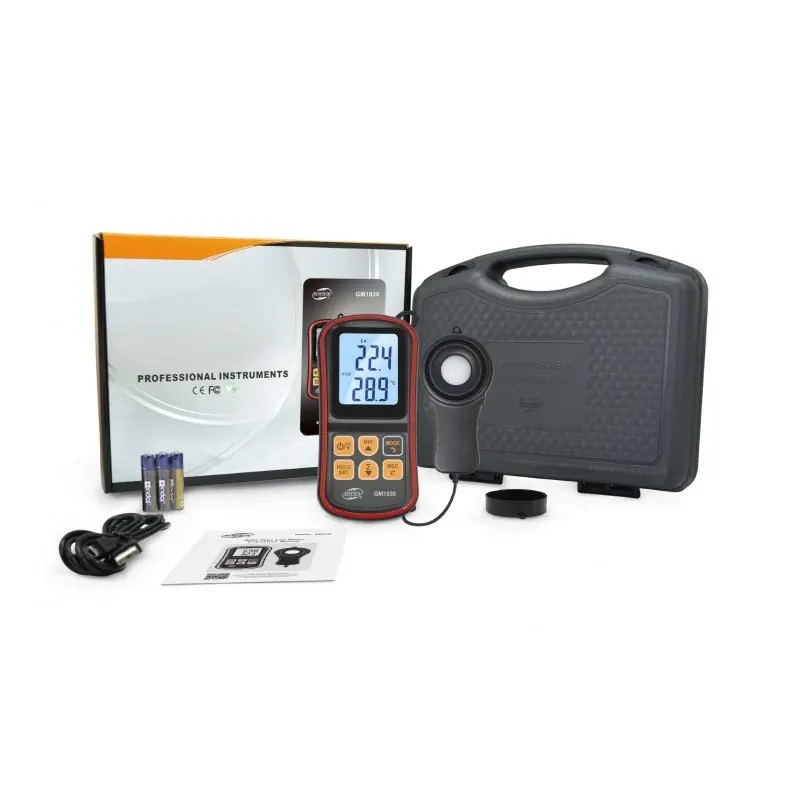 KOMPLEKTACIJA: šviesos matuoklis su Bluetooth Benetech GM1030, 3 x AAA baterijos, USB laidas, dėklas, naudojimo instrukcija