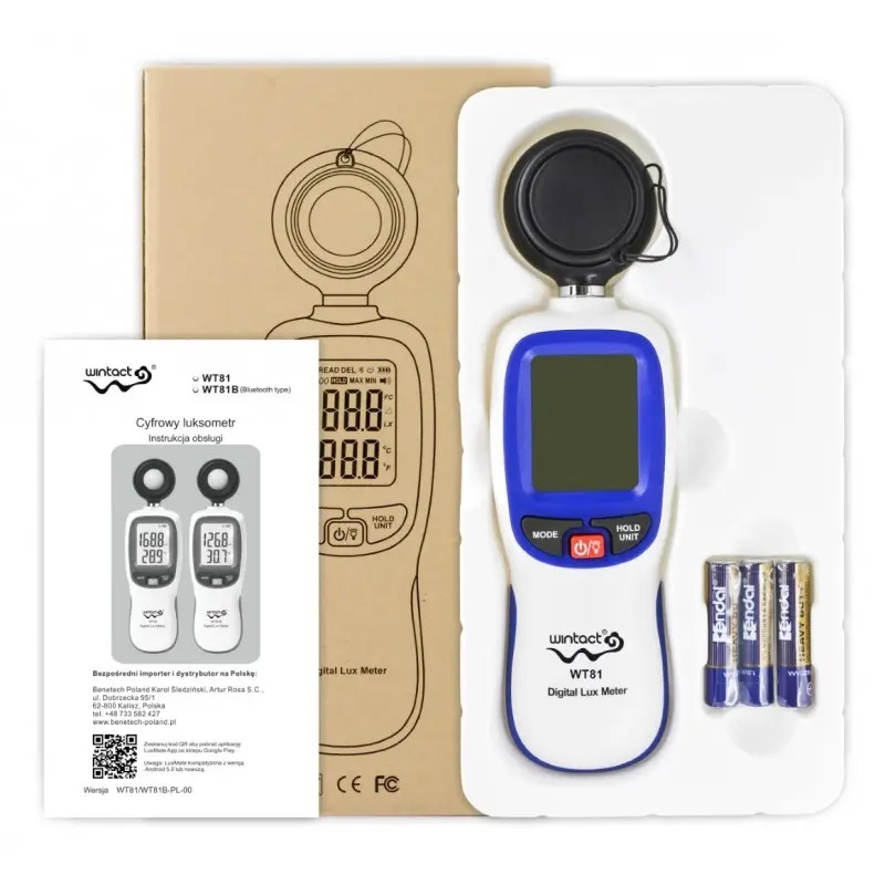 KOMPLEKTACIJA: garso matuoklis su Bluetooth Wintact WT81B, originali gamintojo pakuotė, naudojimo instrukcija, 3 x AAA baterijos