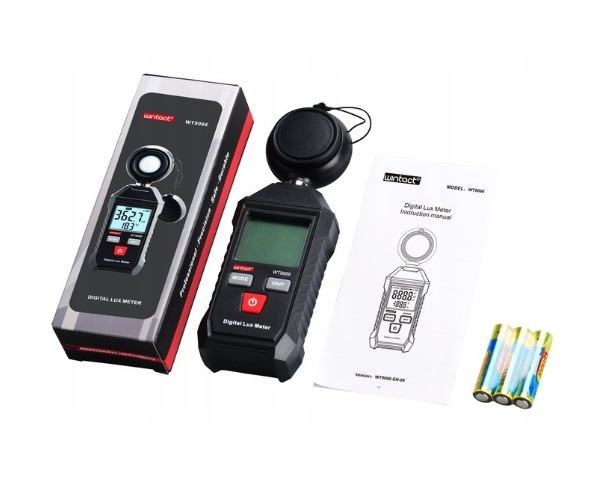 Komplekte yra: šviesos matuoklis Wintact WT9066, 3 vnt. 1,5 V AAA baterijų, naudojimo instrukcija